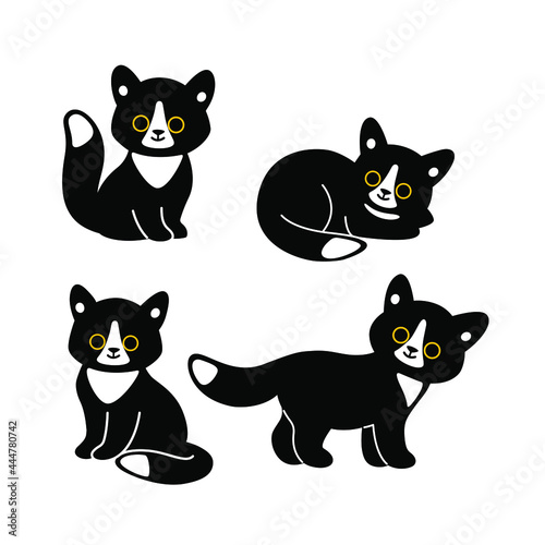 Black cat icon set. Cartoon cat in various poses. Vector illustration for prints, clothing, packaging, stickers.