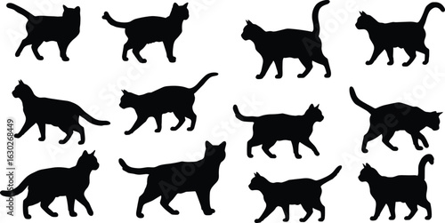Black cat silhouette collection, walking sitting standing poses, vector design