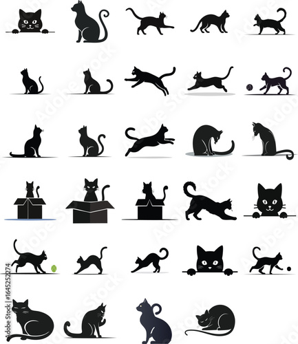 Black Cat Silhouette Vector Icon Set, Solid Animal Poses Collection