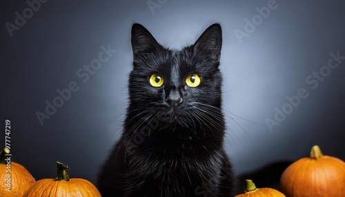 Black cat stares at pumpkins