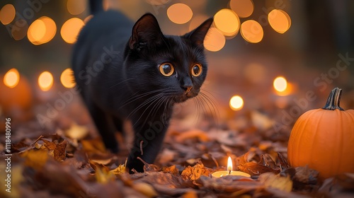 Black cat walking among autumn leaves and lit candles near a pumpkin.