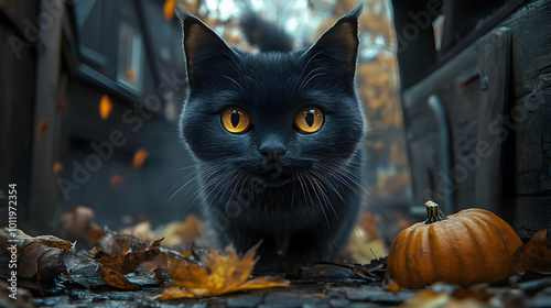 Black Cat with Orange Eyes in Autumn Leaves - Photo