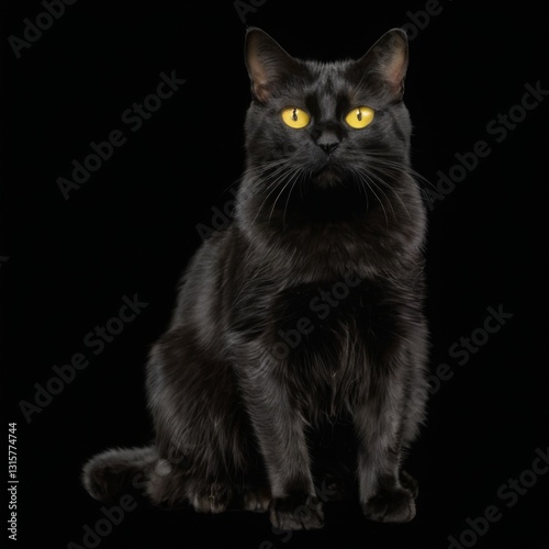 Black cat with serious expression sitting on black background, body angled left, bright yellow eyes, glossy fur.