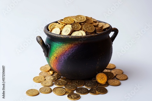 Black cauldron filled with shiny gold coins featuring shamrock symbols, with a subtle rainbow reflection.