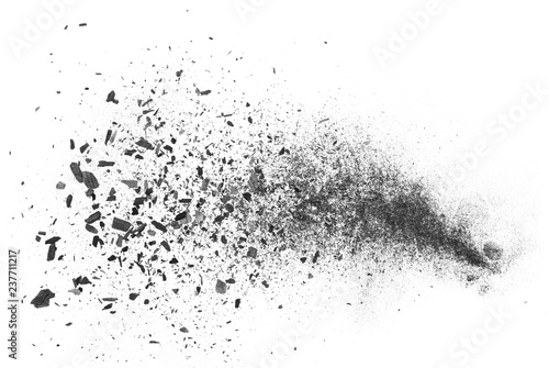 Black charcoal dust, gunpowder explosion isolated on white background and texture, top view