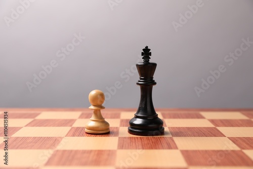 Black chess king and white pawn in middle of chessboard. Competition concept