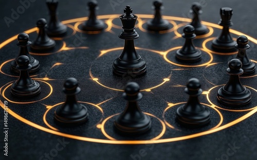 Black chess king piece surrounded in a circular formation by black pawns and other chess pieces with glowing orange circular patterns on a dark surface