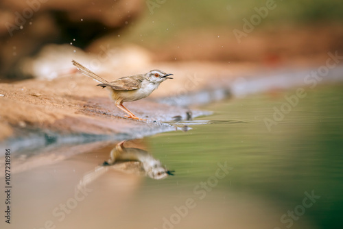 Black chested Prinia bathing in waterhole with reflection in Kruger National park, South Africa ; Specie Prinia flavicans family of Cisticolidae