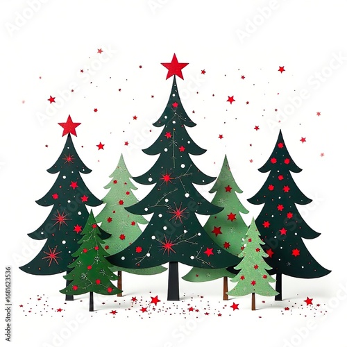 Black Christmas Trees Vector, Green and Red Details, White Background, Festive Minimalist Illustration