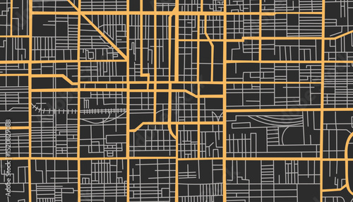 Black city map background with a yellow highways in a flat style. Concept of a travel, destination, location, route. Vector banner, top view.