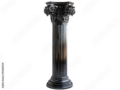 Black classical column with intricate details, isolated on white background. PNG transparent.