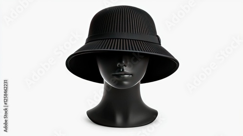 Black cloche hat displayed on a mannequin against a simple white background highlighting its unique design and texture