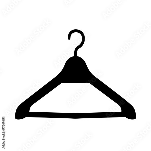 Black clothes hanger icon isolated on white, Simple black silhouette of a clothes hanger with a hook, commonly used in fashion, wardrobe, or laundry icons and apps.