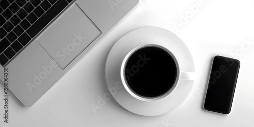 Black coffee in a white cup placed on a clean desk beside a smartphone and a laptop, creating a modern workspace atmosphere for productivity and focus