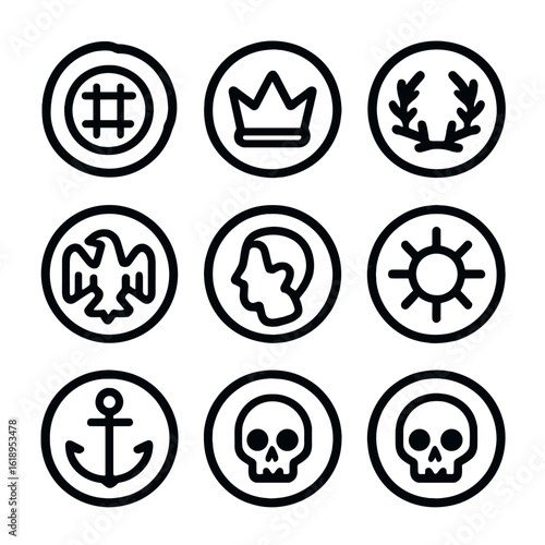 Black Coin Icons. Solid, filled icon set of coin types and designs: ancient coin, modern coin, gold coin with crown, coin with