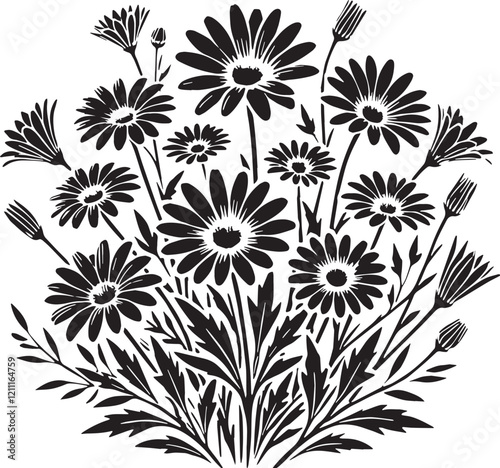 Black Color Daisies Silhouette Vector Illustration, Solid White Background. minimal vector design