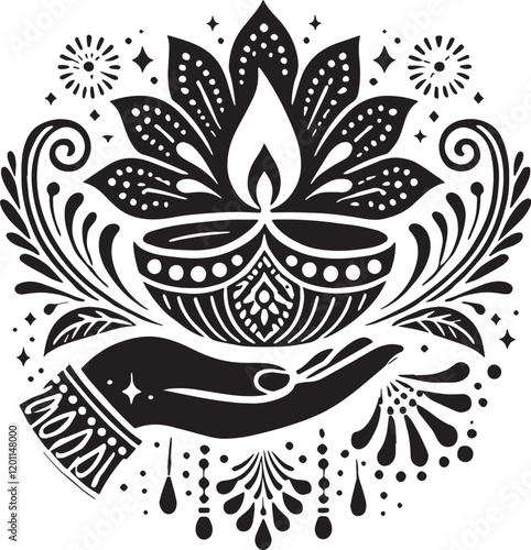 Black Color Diwali Silhouette Vector Illustration, Solid White Background
