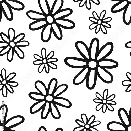 Black contour daisy flowers isolated on white background. Cute monochrome seamless pattern. Hand drawn vector flat graphic illustration. Texture.