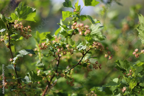 Black currant bush bloomed in spring with small flowers. Future harvest. Close up. Selective focus.