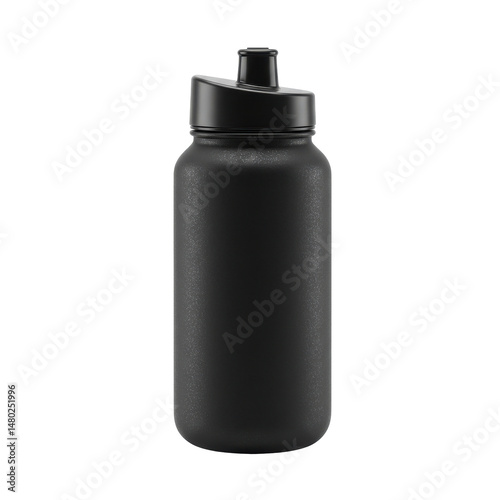 Black cylindrical bottle with a lid and nozzle on a black background in center frame