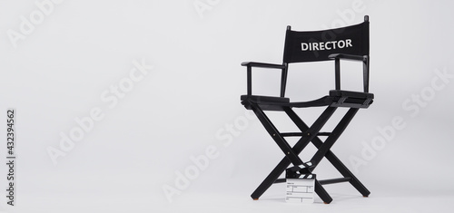 Black director chair and small white slate or clapper board or movie slate use in video production and cinema industry on whitebackground.