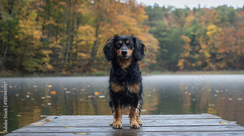 Black dog standing on a wooden dock in front of an autumn lake