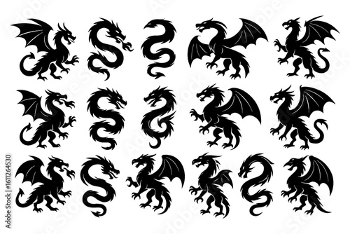 Black dragon silhouettes with wings, serpentine forms, and curled emblems, Transparent Background