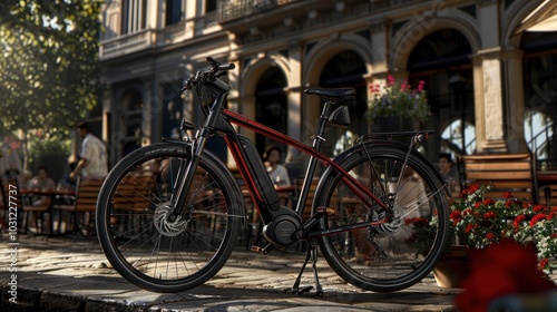 Black Electric Bike Parked on Cobblestone Street with Red Accents
