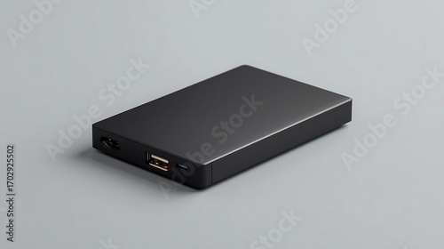 Black external hard drive on plain background, clean and sharp product shot