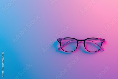 Black eyeglasses lay on a blue and purple gradient background. Generative AI