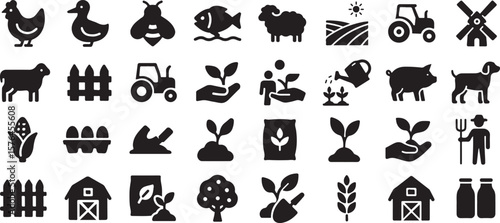 Black Farm Icons Chicken Duck Bee Fish Sheep Tractor Windmill