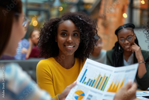 Black female project executive give printed handout materials to diverse teammates on meeting in office. Multiethnic staff group discuss sales result on briefing using paper reports with charts graphs