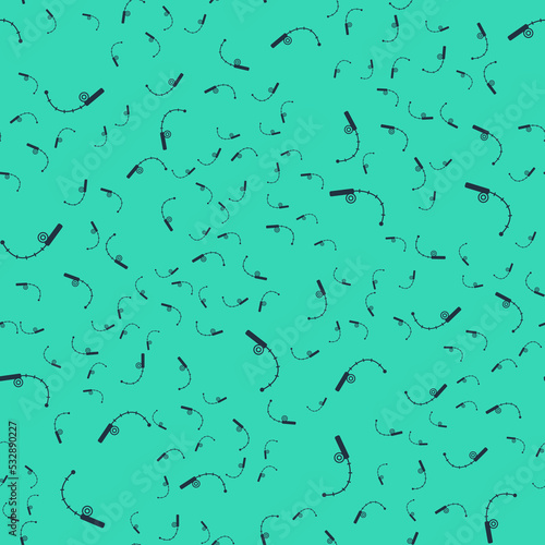 Black Fishing rod icon isolated seamless pattern on green background. Catch a big fish. Fishing equipment and fish farming topics. Vector