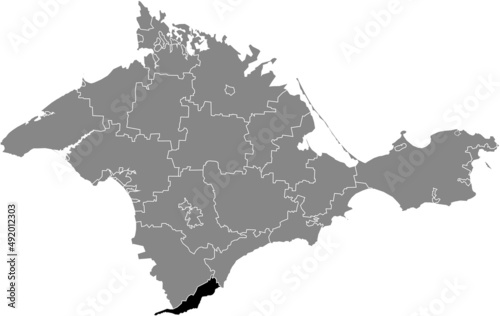 Black flat blank highlighted location map of the YALTA MUNICIPALITY inside gray administrative map of raions and city municipalities of the Autonomous Republic of Crimea, Ukraine