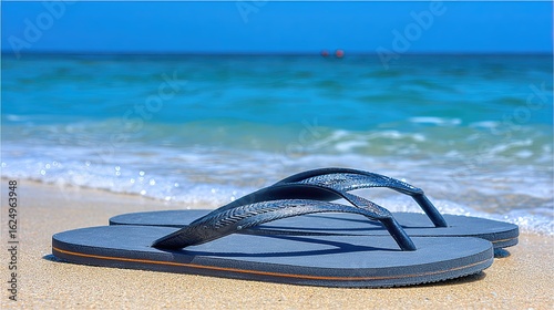 Black Flip Flops Resting on Sandy Beach With Gentle Waves and Clear Blue Water in Background