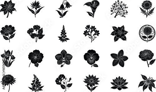 Black Floral Silhouette Vector Icons Collection – Decorative Botanical Flowers, Plants, and Nature Clipart Bundle for Logos, Patterns, Invitations, Crafts, and Digital Graphic Design