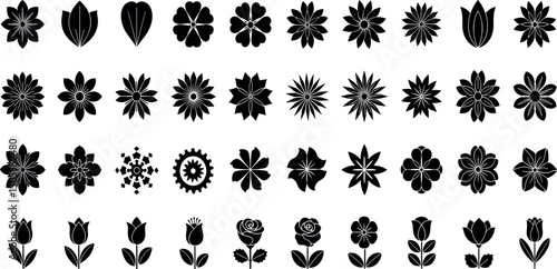 Black flower vector set feature abstract floral design silhouettes, and geometric patterns. Ideal for decoration, logos, and design projects. Includes minimalist botanical elements for creative