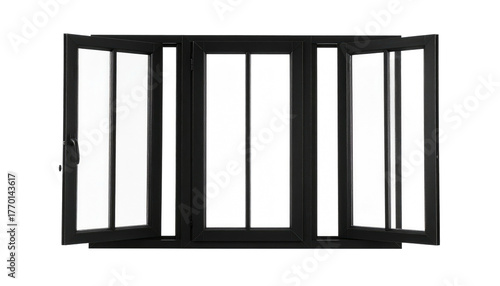 Black framed, three-pane window, side panes are open on a transparent background, clean and simple