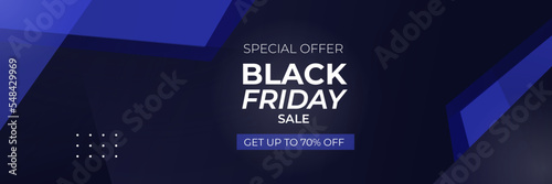 Black Friday and Cyber Monday banner long narrow header for website. 3d black and blue realistic design and sale text. Stock vector illustration.
