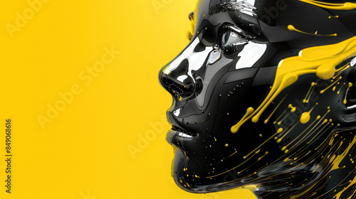 Black glossy humanoid robot head with yellow paint