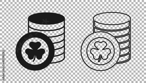 Black Golden leprechaun coin with clover trefoil leaf icon isolated on transparent background. Happy Saint Patricks day. National Irish holiday. Vector