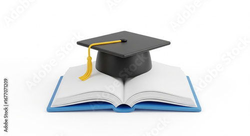 Black graduation cap with a golden tassel resting on an open blue book, symbolizing education and academic achievement on an isolated transparent background.