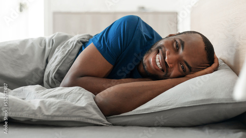 Black Guy Posing Lying In Bed Smiling Resting At Home