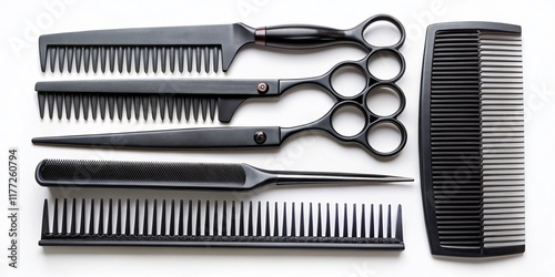 Black Hairdressing Combs & Scissors in Craft Packaging - Professional Hair Styling Tools on White Background