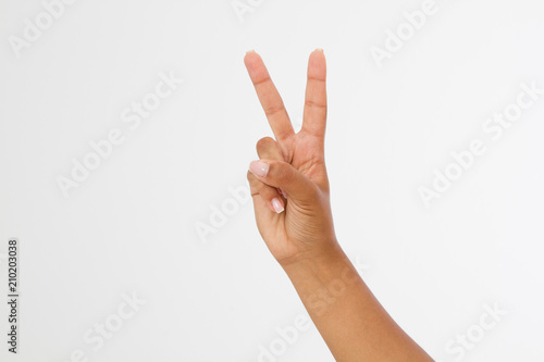 black Hand showing the sign of victory or peace closeup isolated on white background.Front view. Mock up. Copy space. Template. Blank.