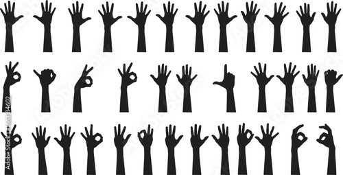 Black hand silhouette gestures, communication symbols, sign language, hand signs, gestures collection, isolated on white background, vector style