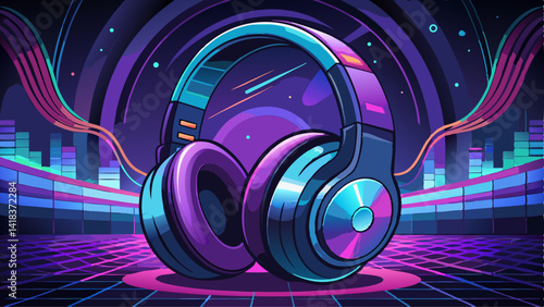 Black headphones on a dark background, 3D rendering, Neon lights,