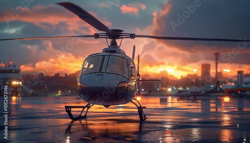 Black Helicopter Parked on Wet Runway at Sunset