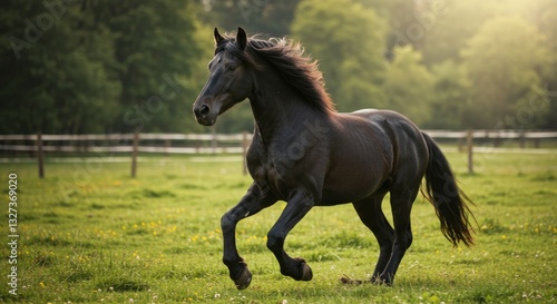 Black Horse Galloping in Green Pasture - A powerful black horse runs freely across a vibrant green field, symbolizing freedom, grace, strength, nature, and untamed spirit