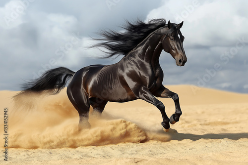 Black Horse in Motion, Running Through Sandy Desert with Sand Dunes and Cloudy Sky in the Background